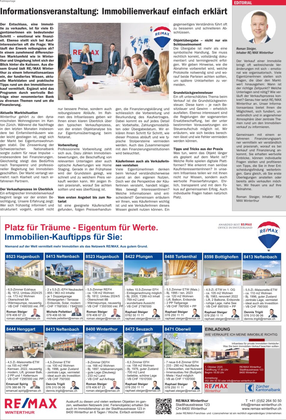 Der Entschluss, eine Immobilie zu verkaufen, ist für viele EigentümerInnen ein bedeutender Schritt – emotional wie finanziell. Ebenso stellt sich bei Kaufinteressierten oft die Frage: Wie läuft der Erwerb reibungslos ab? In einem zunehmend differenzierten Marktumfeld wie in Winterthur und Umgebung lohnt sich der Blick hinter die Kulissen. Aus diesem Grund lädt RE/MAX Winterthur zu einem Informationsanlass ein, der fundiertes Wissen, aktuelle Marktdaten und praktische Tipps rund um den Immobilienverkauf vermittelt. Ergänzt wird das Programm durch wertvolle Beiträge einer renommierten Bank zu diversen Themen rund um die Finanzierung.