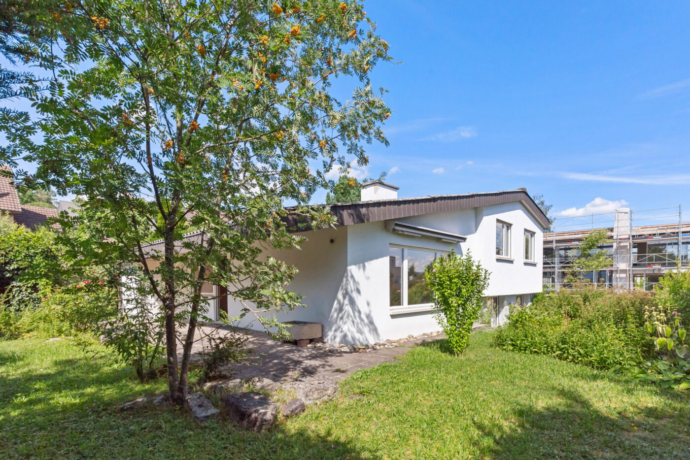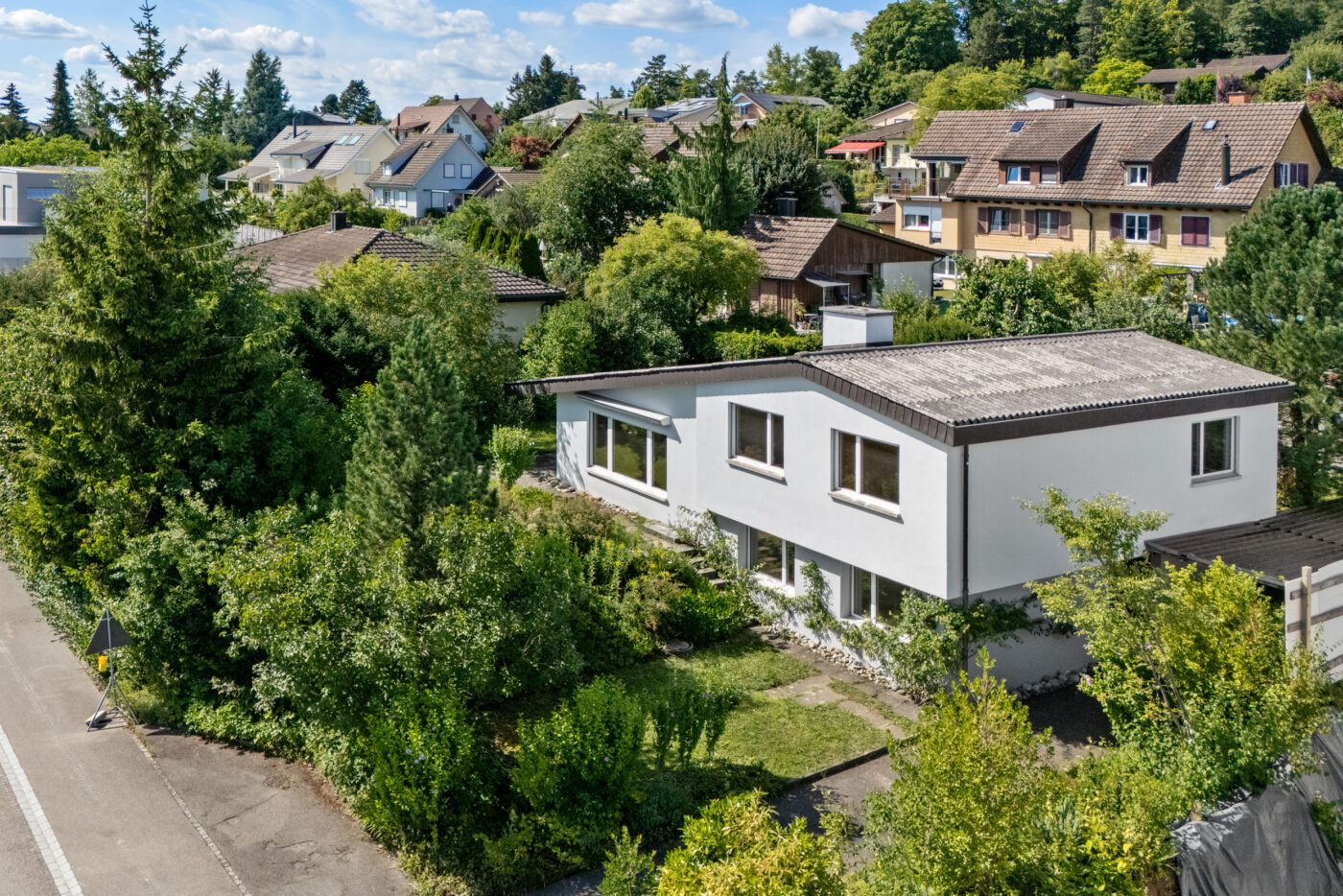 Das Kellergeschoss umfasst mehrere funktionale Räume, darunter einen Abstellraum, den Luftschutz- und den Öltankkeller sowie den Heiz- und Waschraum. Ein separater Kellerraum sorgt zusätzlich für optimale Lagerkapazitäten. Ein Carport sowie 2-3 weitere Aussenstellplätze bieten ausreichend Parkmöglichkeiten für die ganze Familie. Die idyllische, gut besonnte Gartenanlage mit pflegeleichter Grünfläche, Sträuchern und Bäumen schafft ein angenehmes Wohnumfeld. Zwei gemütliche, gedeckte Sitzplätze laden zum Verweilen im Freien ein.