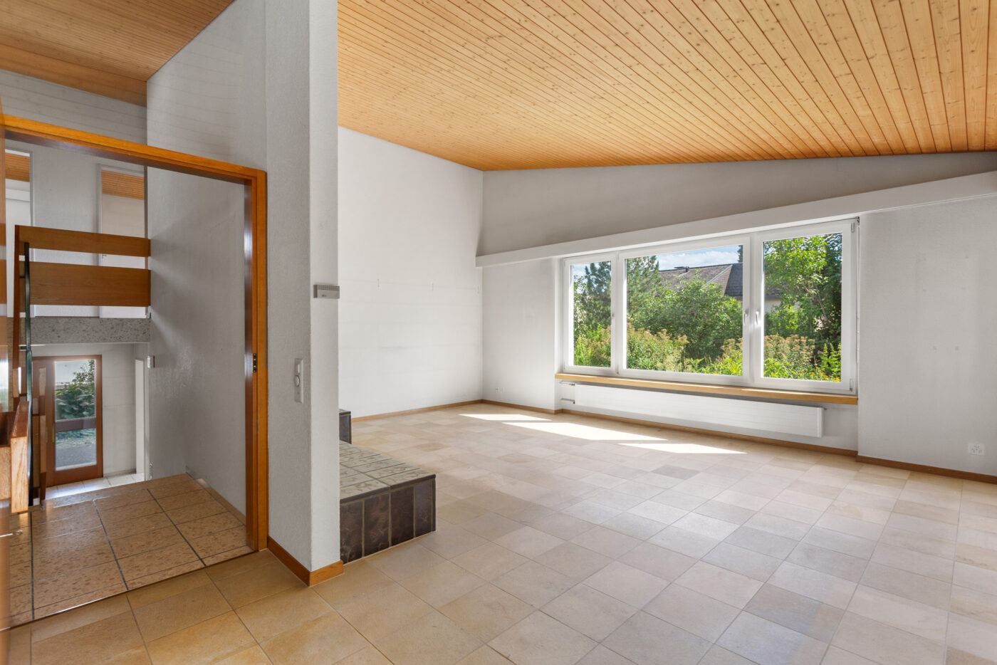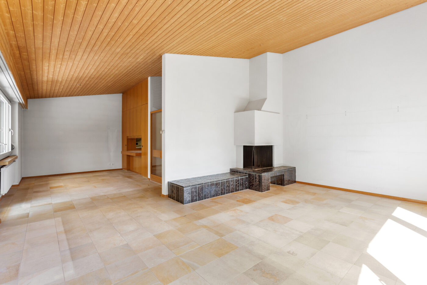 Das Wohn- und Esszimmer besticht durch seinen grosszügigen Grundriss, die angenehme Helligkeit sowie die hohen Wohnräume, die ein besonderes Raumgefühl vermitteln. Schöne Steinböden verleihen dem Raum eine edle und pflegeleichte Note. Ein grosses Cheminée sorgt für warme und gemütliche Stunden und lädt zum Verweilen ein. Die angrenzende, grosszügige Küche mit Durchreiche ist bestens ausgestattet und bietet viel Stauraum. Vom Esszimmer aus gelangen Sie direkt auf den gemütlichen Sitzplatz im Garten – ideal für entspannte Stunden im Freien.