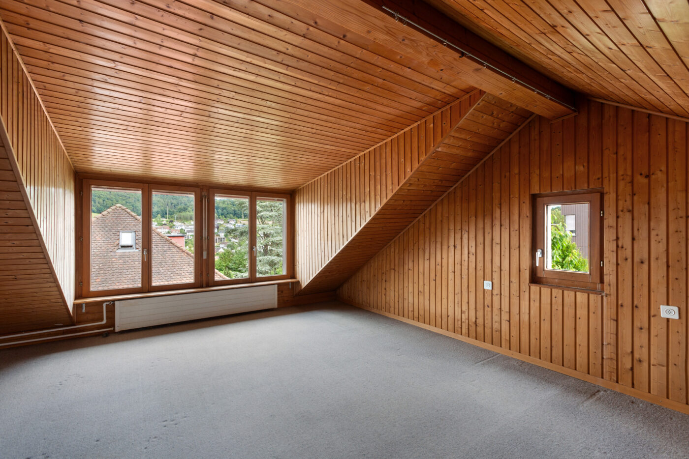 Im Obergeschoss befinden sich drei Schlafzimmer, ein Bad/WC und ein grosser Balkon (ca. 15 m²) mit schöner Aussicht. Das Dachgeschoss ist vollständig ausgebaut und gedämmt und bietet mit Estrich und zwei Stauräumen zusätzlichen Platz für flexible Nutzung.