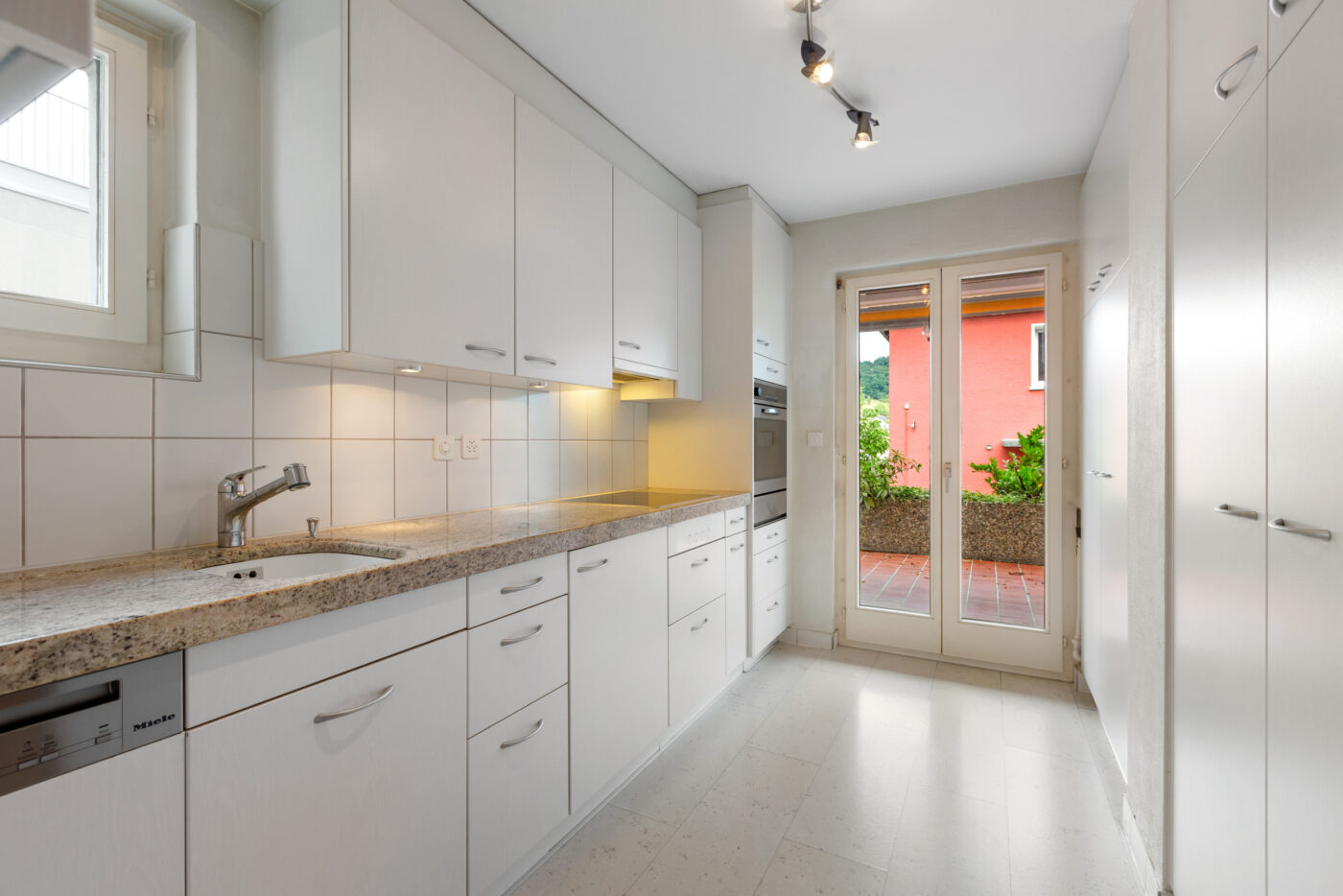 Im Erdgeschoss bietet das Haus ein helles Wohnzimmer und eine moderne Küche, beide mit direktem Zugang zur grossen, gedeckten Terrasse (ca. 31 m²) mit automatischen Sonnenstoren. Ein grosszügiges Entrée mit Sitzplatz, ein Gäste-WC sowie ein gedeckter Eingang runden das Raumangebot auf dieser Etage ab.