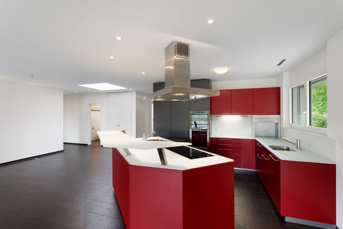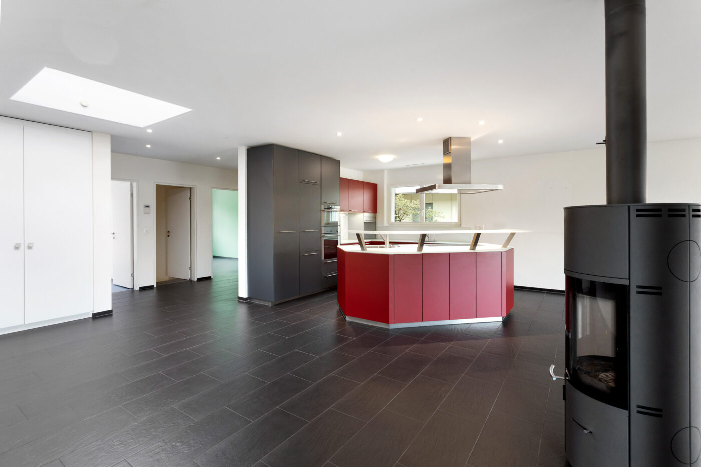 Grossflächige Fensterfronten sowie zusätzliche Dachfenster durchfluten sämtliche Räume mit natürlichem Licht und schaffen eine helle, freundliche Atmosphäre mit besonderem Wohnambiente.