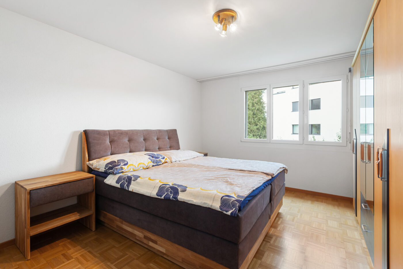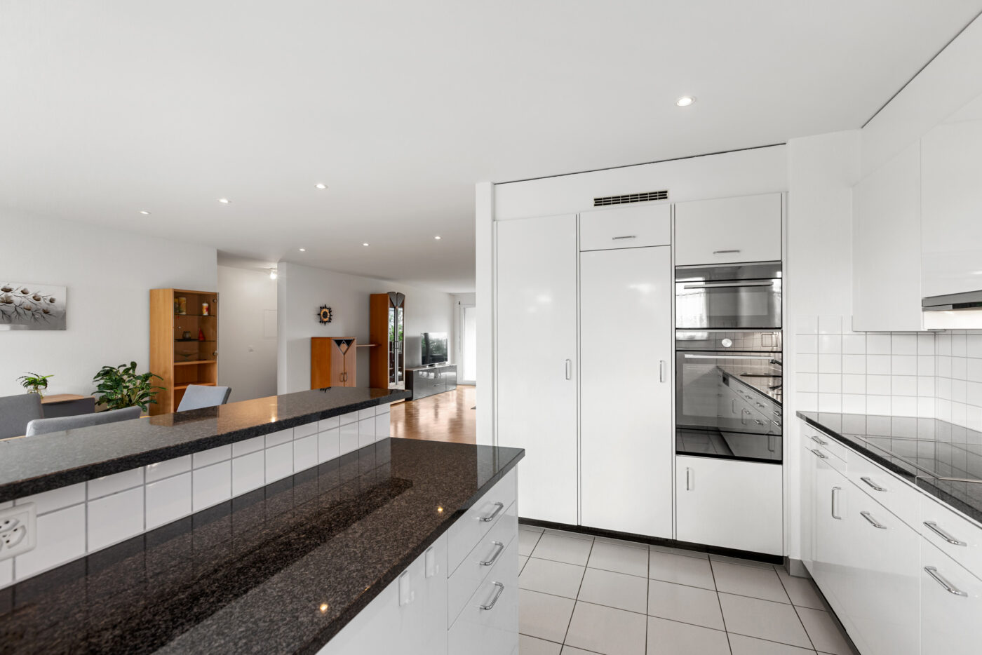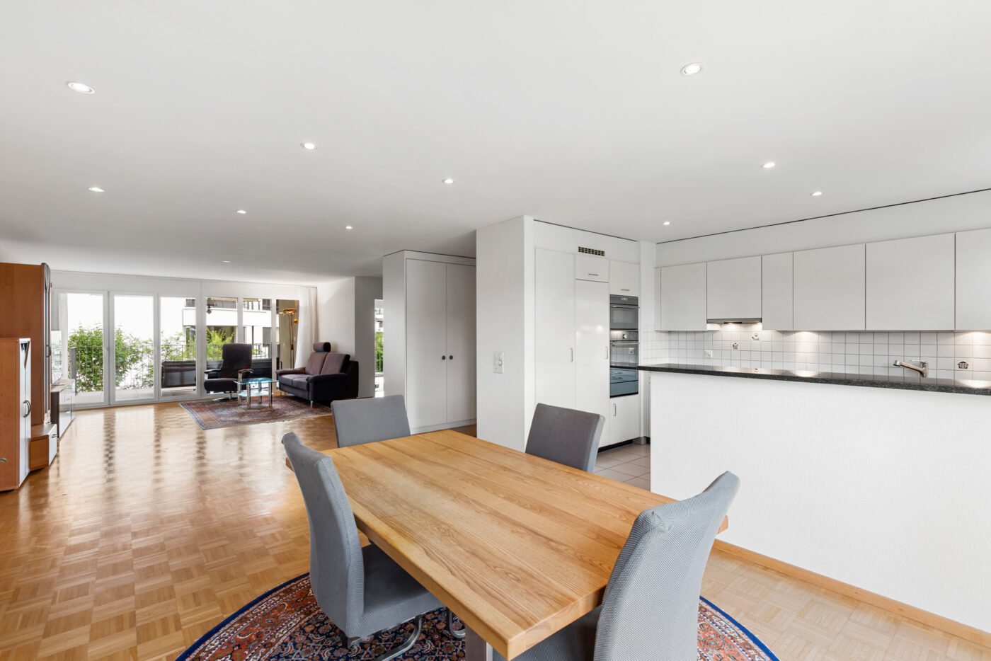Auf der linken Seite befindet sich die geräumige Küche mit einem integrierten Essbereich. Die Küche ist vom Wohnbereich klar getrennt, was eine angenehme Gliederung schafft und Ruhe sowie Struktur im Alltag bietet. Rechts vom Eingang liegt das helle Wohnzimmer, das vielfältige Einrichtungsmöglichkeiten bietet. Von hier gelangen Sie direkt auf den sonnigen Balkon mit neuem Bodenbelag und schöner Aussicht ins Grüne ein idealer Ort zum Entspannen oder für einen Kaffee im Freien. Direkt neben dem Wohnzimmer befindet sich ein Zimmer, das sich ideal als Homeoffice, Gästezimmer oder Kinderzimmer eignet. Der hintere Bereich der Wohnung umfasst zwei grosse Schlafzimmer sowie zwei Nasszellen: ein Badezimmer mit Badewanne und eine frisch renovierte mit Dusche.