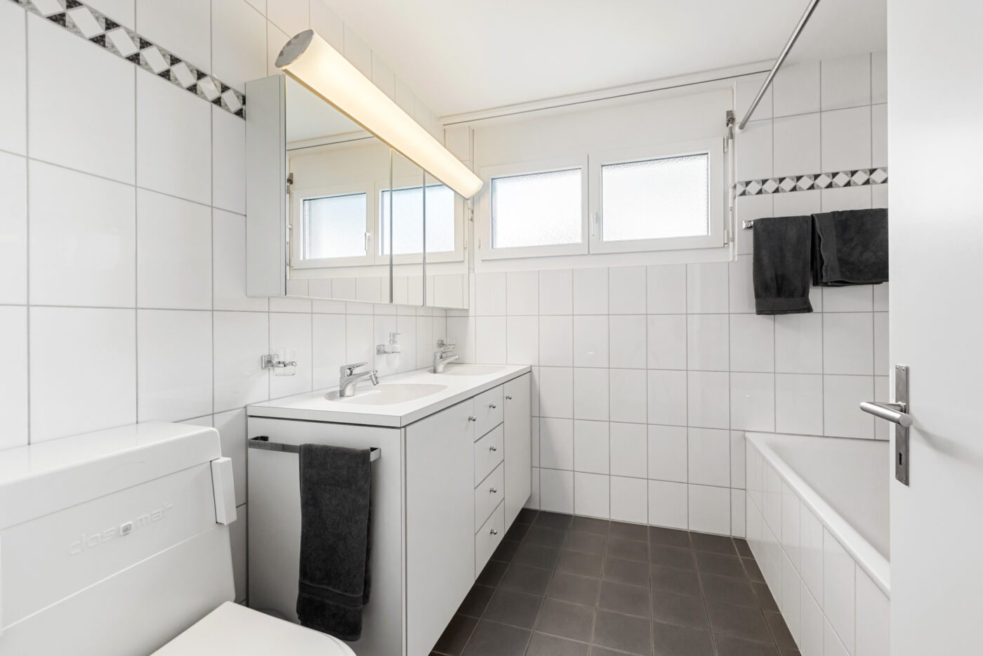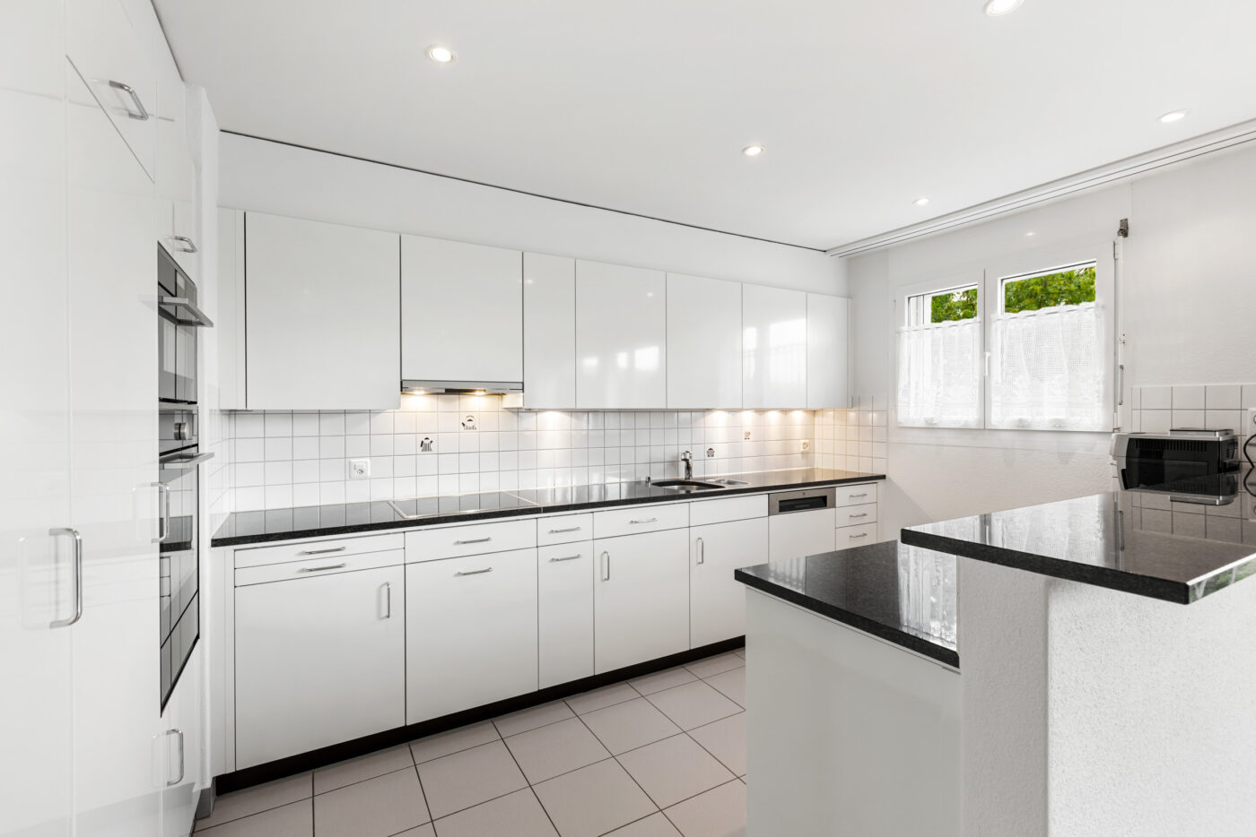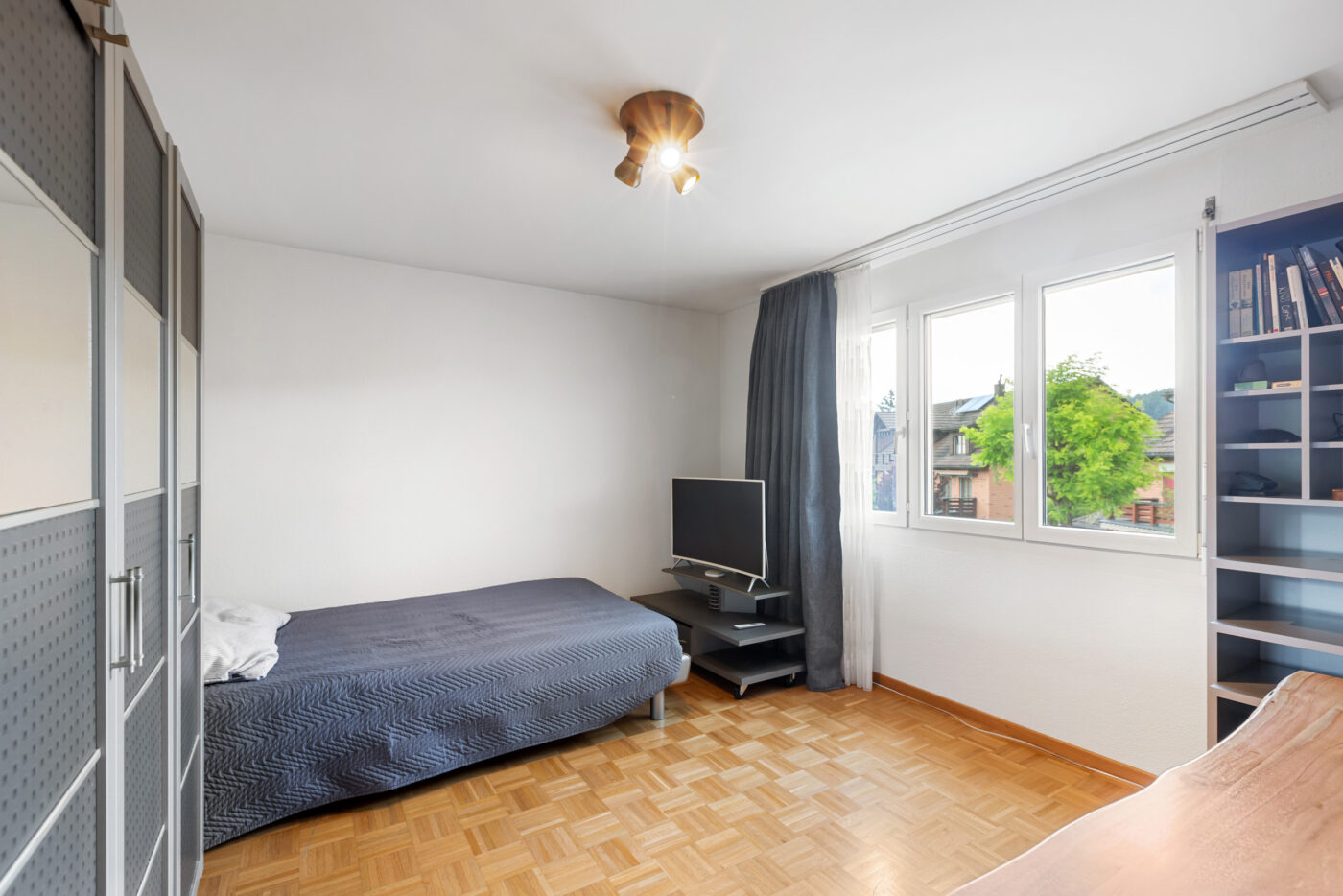Auf der linken Seite befindet sich die geräumige Küche mit einem integrierten Essbereich. Die Küche ist vom Wohnbereich klar getrennt, was eine angenehme Gliederung schafft und Ruhe sowie Struktur im Alltag bietet. Rechts vom Eingang liegt das helle Wohnzimmer, das vielfältige Einrichtungsmöglichkeiten bietet. Von hier gelangen Sie direkt auf den sonnigen Balkon mit neuem Bodenbelag und schöner Aussicht ins Grüne ein idealer Ort zum Entspannen oder für einen Kaffee im Freien. Direkt neben dem Wohnzimmer befindet sich ein Zimmer, das sich ideal als Homeoffice, Gästezimmer oder Kinderzimmer eignet. Der hintere Bereich der Wohnung umfasst zwei grosse Schlafzimmer sowie zwei Nasszellen: ein Badezimmer mit Badewanne und eine frisch renovierte mit Dusche.