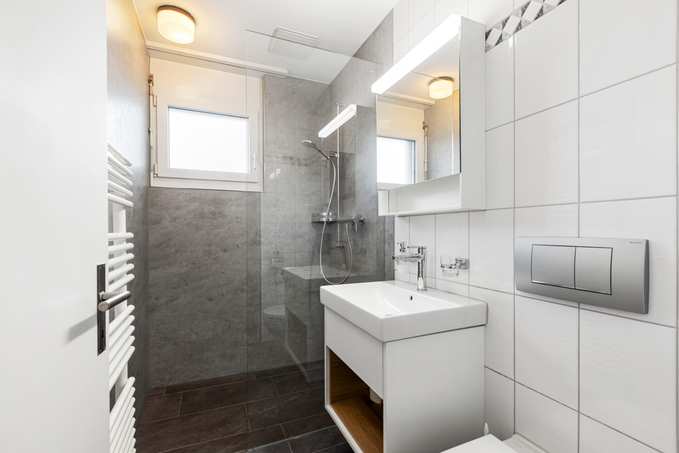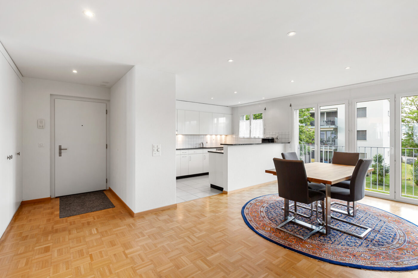 Der Eingangsbereich bietet ausreichend Platz für eine Garderobe und öffnet sich direkt danach in die Wohnung. Dank der offenen und grosszügigen Gestaltung sowie der grossen Fenster wirkt die Wohnung gleich angenehm hell und freundlich.