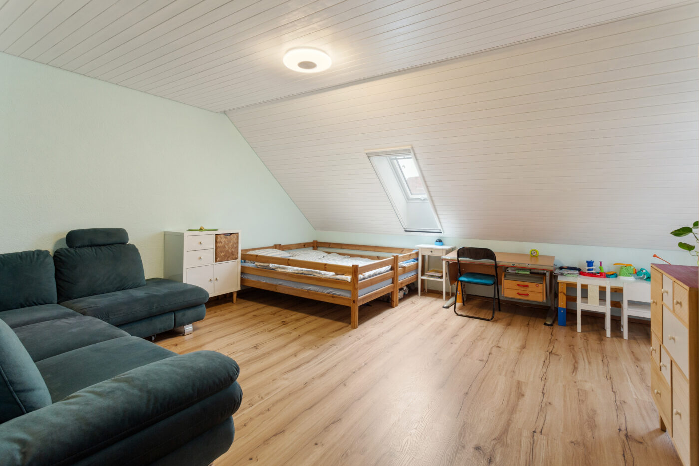 Über eine Treppe erschliesst das ausgebaute Dachgeschoss einen Vorraum, ein weiteres Zimmer sowie einen grosszügigen, flexibel nutzbaren Disponibelraum/Zimmer mit Cheminée, der sich ideal als Büro, Hobbybereich oder als weiteres Schlafzimmer eignet.