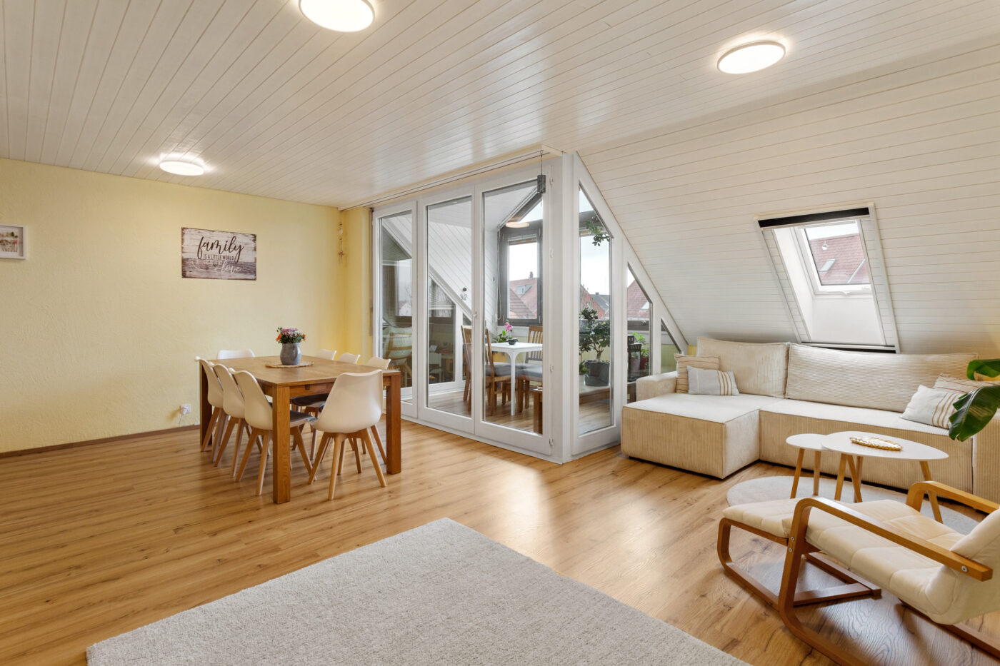 Die attraktive 5.5-Zimmer-Maisonettewohnung mit ausgebautem Dachgeschoss und Loggia an der Schlossschürstrasse 12 in 8409 Winterthur überzeugt durch ihren grosszügigen Innenausbau und ein durchdachtes Grundrisskonzept.