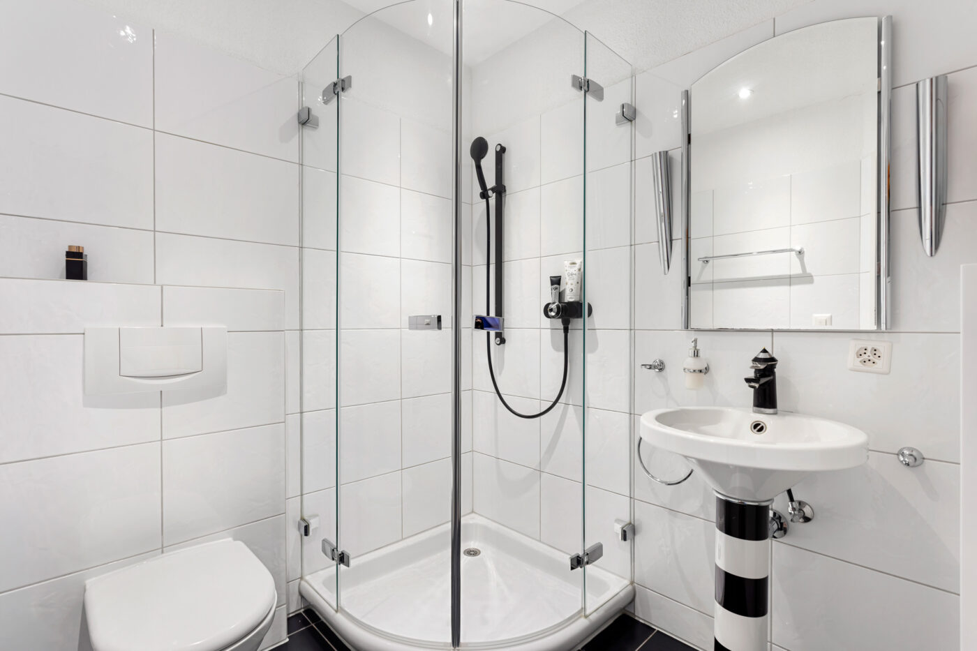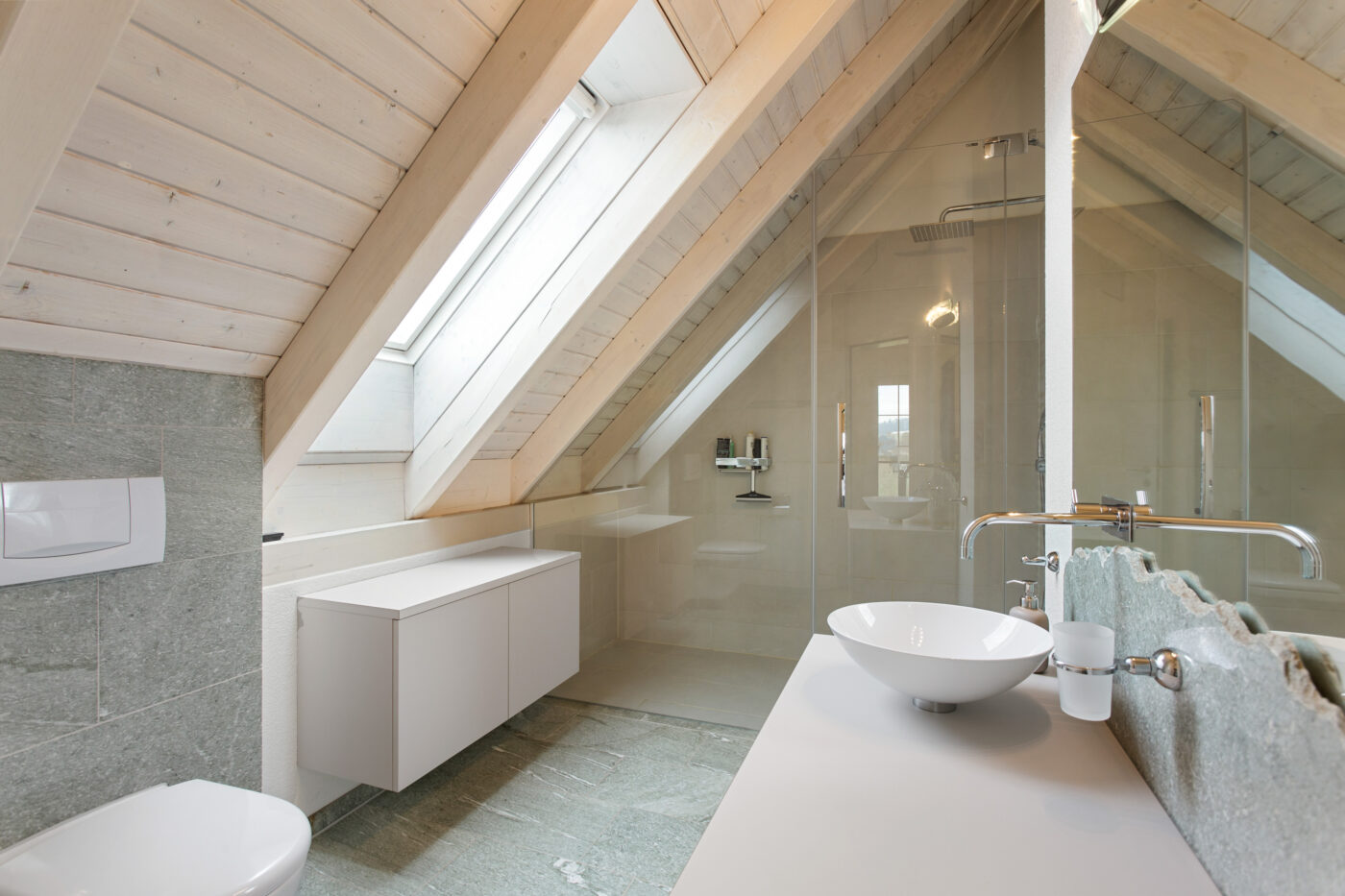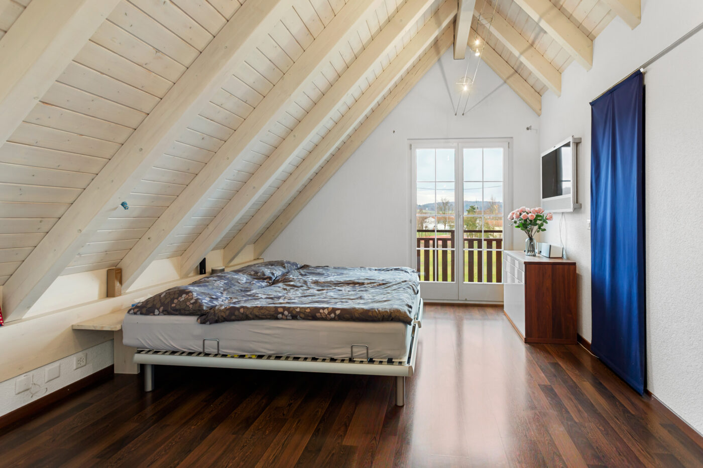 Die obere Ebene beherbergt ein grosses Schlafzimmer mit begehbarem Kleiderschrank sowie angrenzend ein grosses Badezimmer mit Dusche/WC und eine Waschküche mit Waschturm. Alle Räume sind mit Fenstern ausgestattet. Ein dazugehöriges Kellerabteil sowie ein gemeinsamer Veloraum und Trocknungsraum sorgen für zusätzlichen Stauraum.