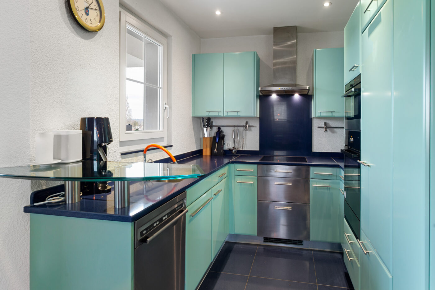 Das helle Wohn- und Esszimmer bildet das Herzstück der Wohnung, angrenzend liegt die moderne Küche mit reichlich Stauraum. Vom Essbereich aus gelangt man auf den 14 m² grossen Balkon mit unverbaubarer Aussicht – ideal für entspannte Stunden im Freien.
