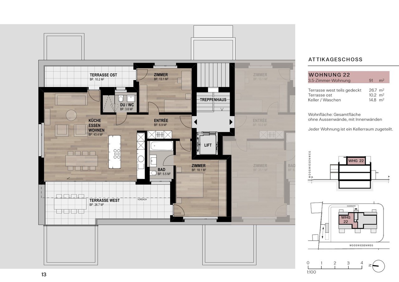 Die Attikawohnung mit 91 m² Wohnfläche ist mit dem Lift erreichbar und besticht durch zwei grosszügige, teilweise gedeckte Terrassen mit grossen Fensterfronten, die viel Licht und Weite in Ihr Zuhause bringen: eine vom Wohnbereich und Schlafzimmer über Schiebefenster zugänglich, die andere vom zweiten Schlafzimmer und Wohnbereich. Zwei Schlafzimmer, zwei Badezimmer (eines mit Badewanne, eines mit Dusche/WC) und ein offener Wohn-/Küchenbereich runden das Angebot wunderbar ab. Die teilweise gedeckten Terrassen sind ideal nach Osten und Westen ausgerichtet und verwöhnen Sie so morgens mit sanfter Morgensonne und abends mit warmem Abendlicht. Ein eigener Keller-/Waschraum mit Waschmaschine und Tumbler ist inklusive. Bei Bedarf kann zusätzlich ein Tiefgaragenparkplatz erworben werden.